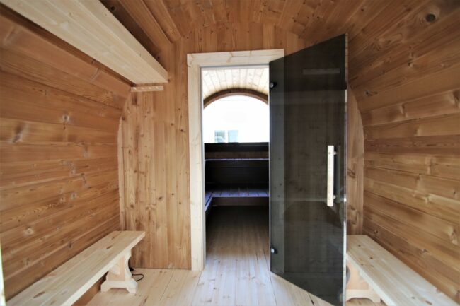 Die Sauna Vivi besticht durch ihre geräumige Bauweise und luxuriöse Ausstattung für intensive Entspannung.