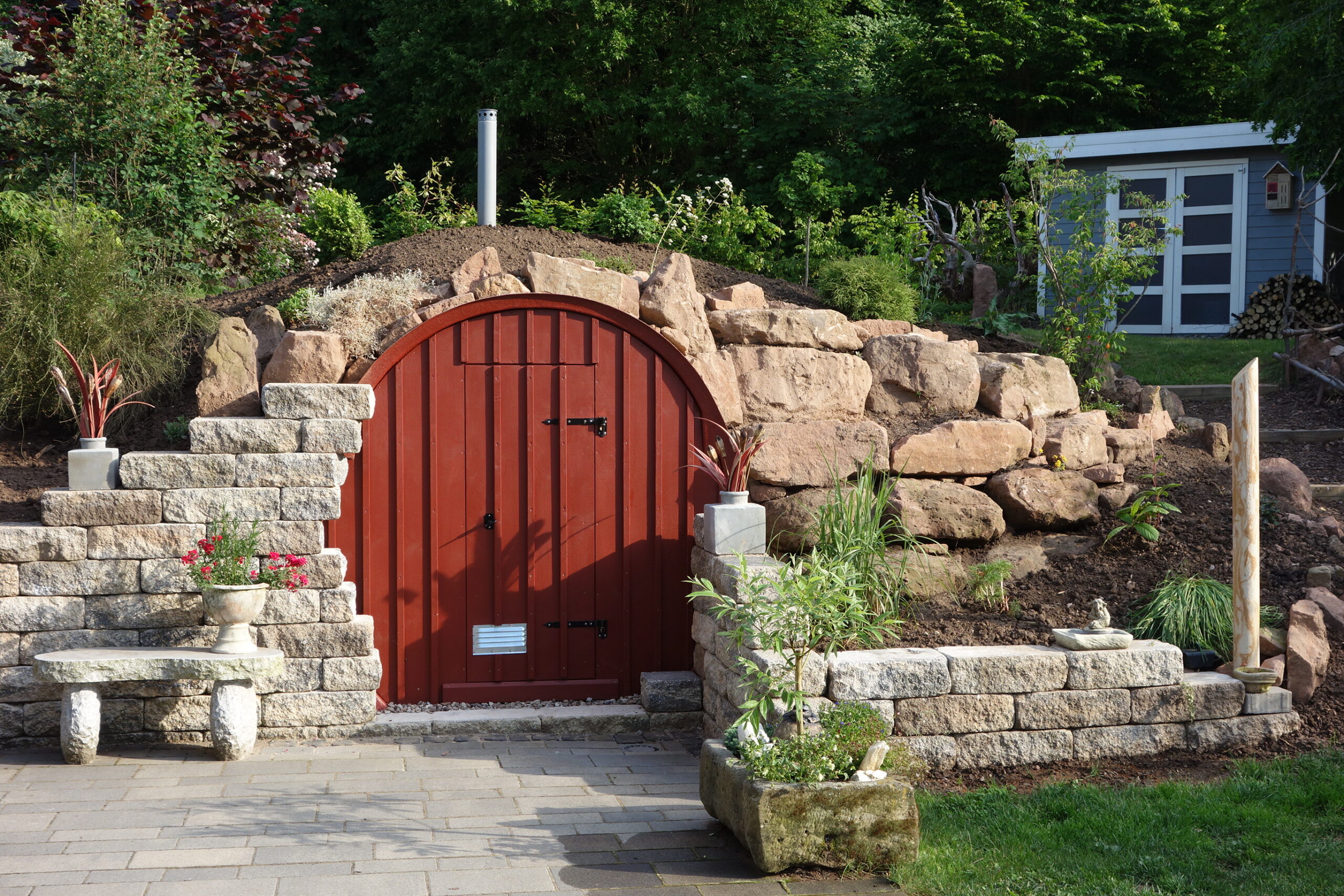 Zusätzlicher Nutzen zum Hauptzweck: ein Erdkeller verleiht dem Garten einen ganz neuen Charakter. Eine wellige Oberfläche sieht oft spannender aus und den kleinen Hügel kann man für den Anbau von Blumen oder Kräuter verwenden. Ein schöner Steingarten zum Beispiel kann zu einem großen Erfolg werden, wenn der Boden gut drainiert ist. Lassen Sie Ihrer Phantasie freien Lauf !