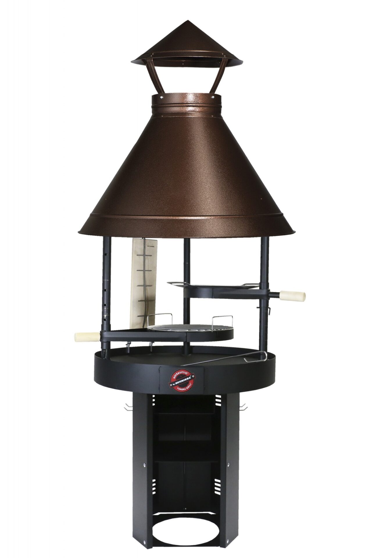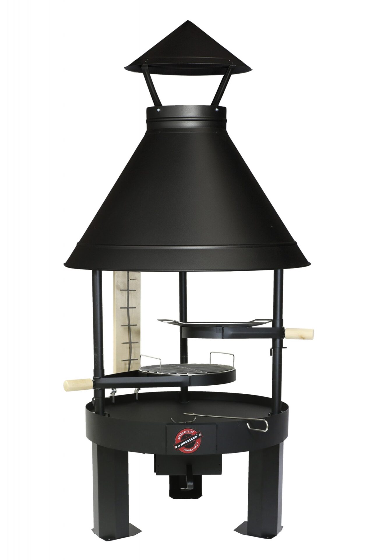 Runde, schwarze Feuerstelle mit 80 cm Durchmesser, ein sechskantiger Fuß und einer Arbeitshöhe von 80 cm.