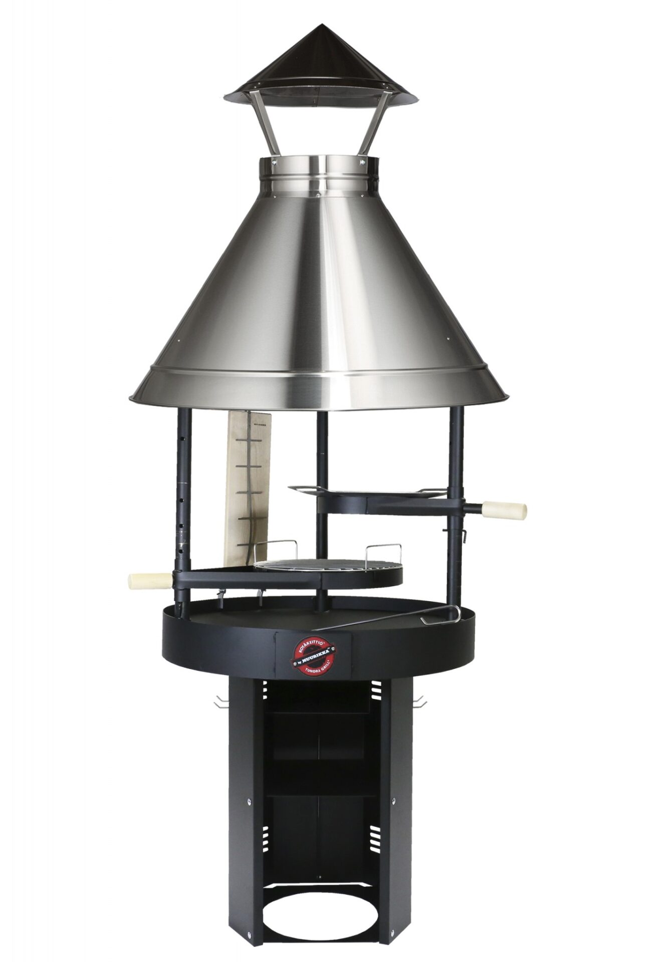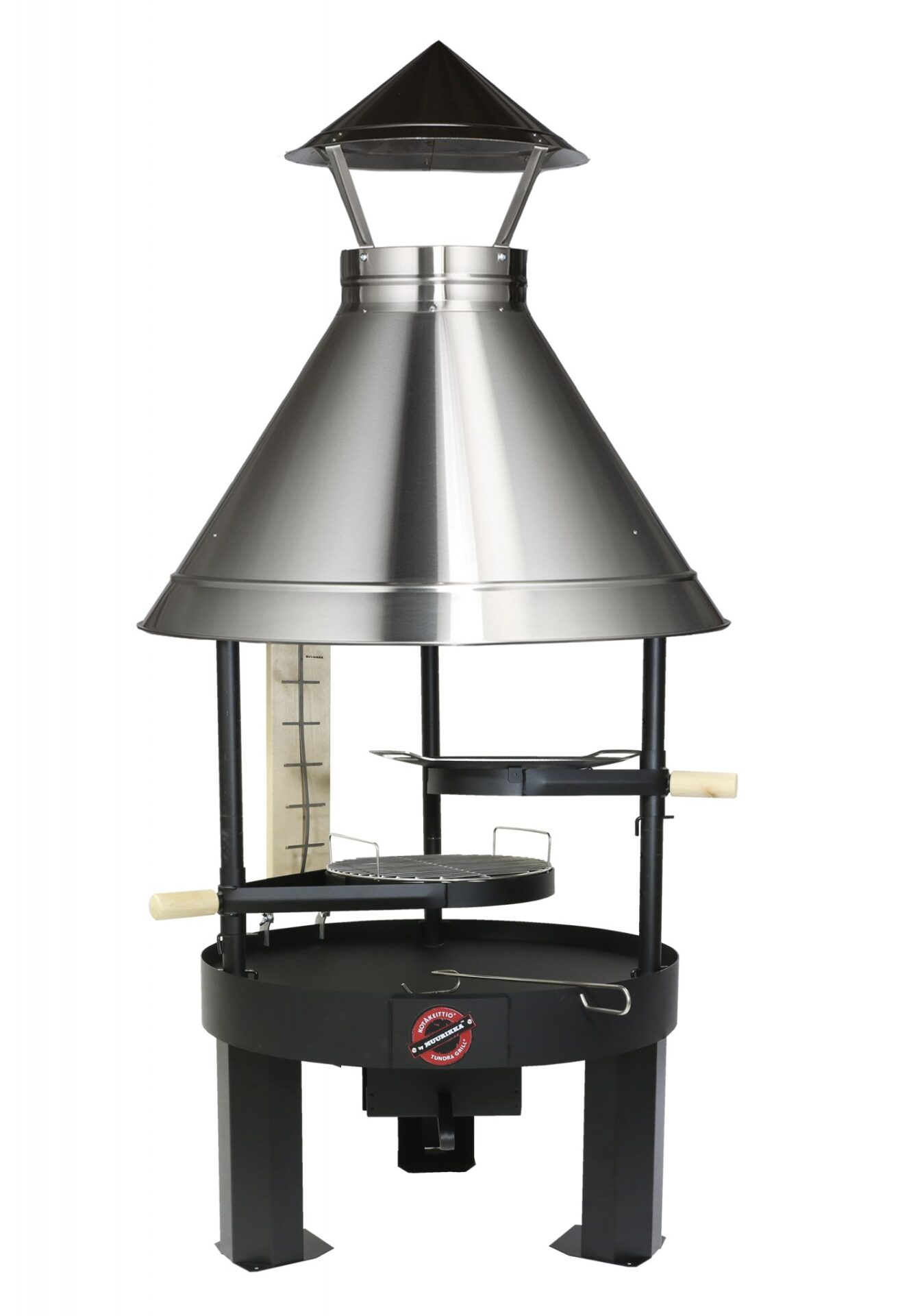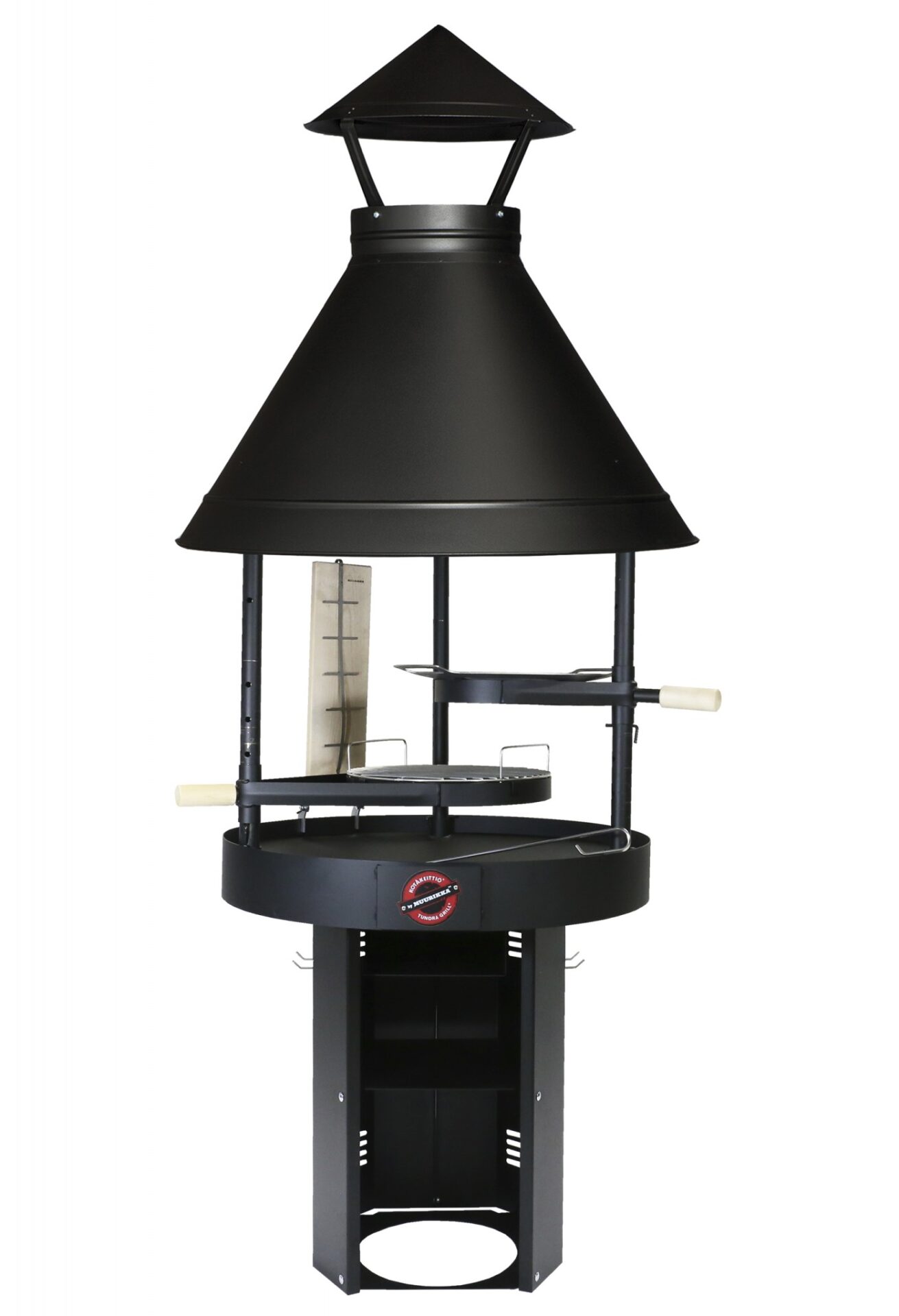 Runde, schwarze Feuerstelle mit 80 cm Durchmesser und einer Arbeitshöhe von 45 cm.