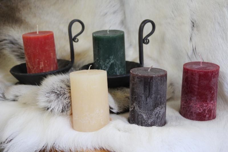 Massive Stumpenkerzen mit langer Brenndauer in verschiedenen Farben und Düften.