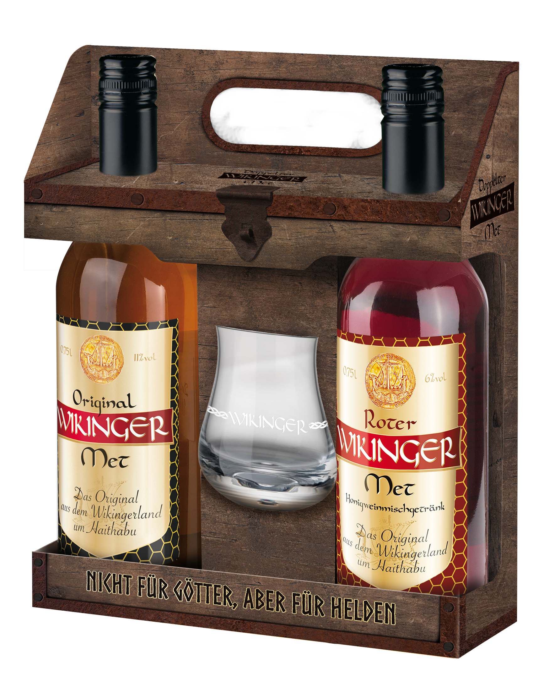 Im Set enthalten ist eine 750 ml Flasche ORIGINAL WIKINGER MET (11% vol.) – der klassische Met mit dem unverfälschten Honiggeschmack und eine 750 ml Flasche ROTER WIKINGER MET (6,0% vol.) – der mit fruchtigem Kirschsaft gemischte Honigwein. auch als „Wikinger-Blut“ oder „Odins Blut“ bezeichnet. In der dekorativen, einer alten Schatzkiste nachempfundenen Geschenkverpackung in Holzoptik steht zwischen den beiden Met Flaschen ein hochwertiges Met-Glas (41cl) mit aufgedrucktem „WIKINGER“-Schriftzug. Durch seine bauchige, sich nach oben verjüngende Form kommt das intensive WIKINGER MET-Honigaroma besonders gut zur Geltung. Ein Tragegriff sorgt für den bequemen Transport. Mit einem kleinen Augenzwinkern lässt sich der bekannte WIKINGER MET-Spruch „Nicht für Götter, aber für Helden“, der im unteren Teil Verpackung zu lesen ist, durchaus als Kompliment für den oder die Beschenkte verstehen und liefert mit Sicherheit eine Menge Gesprächsstoff für eine Lagerfeuer-Nacht voller Geschichten.